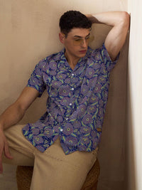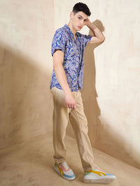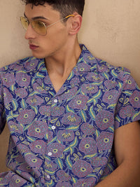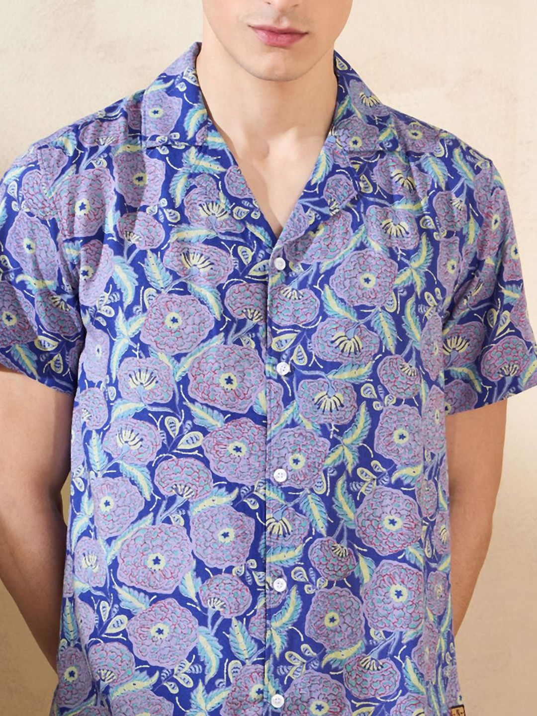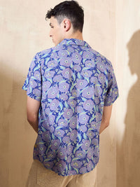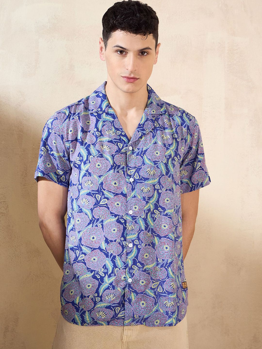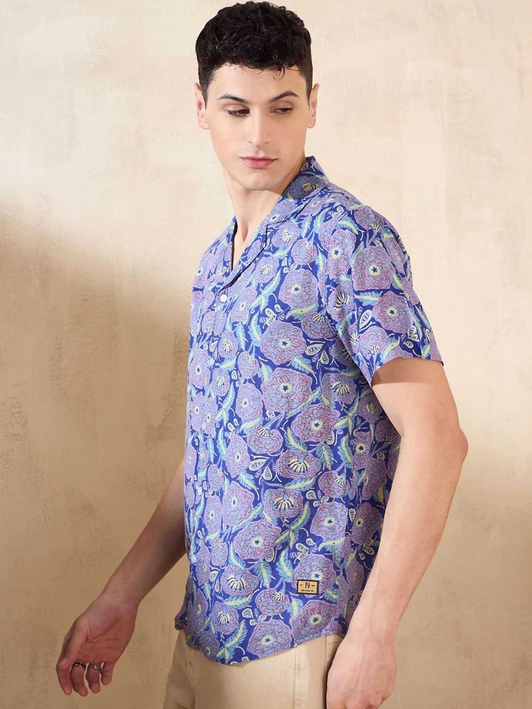 Blue floral printed oversizedcasual shirt ,has a cuban collar, button placket, short regular sleeves, curved hem