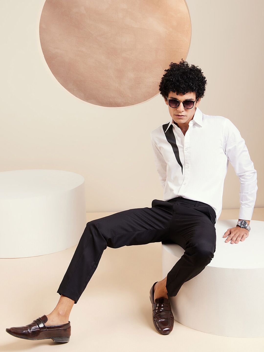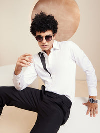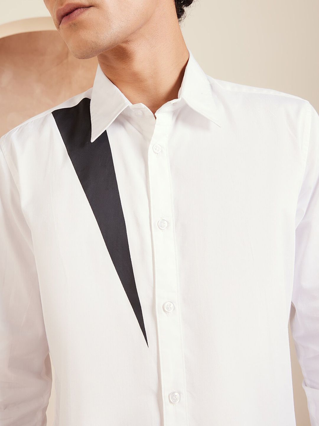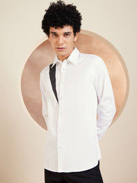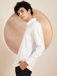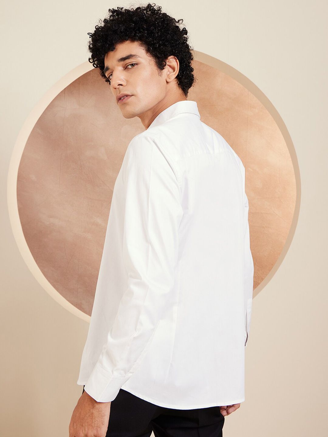 White solid opaque casual shirt ,has a spread collar, button placket, long regular sleeves, curved hem