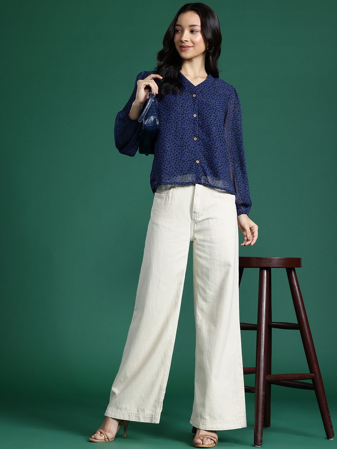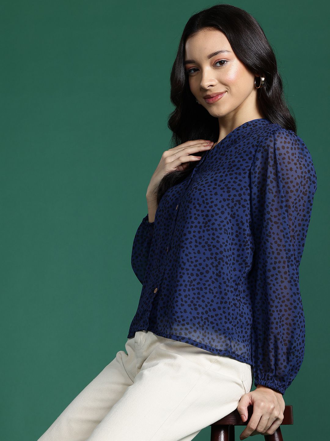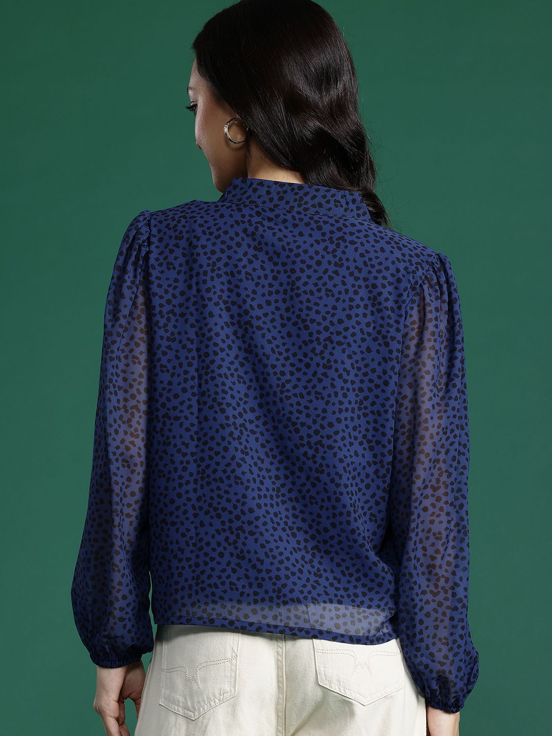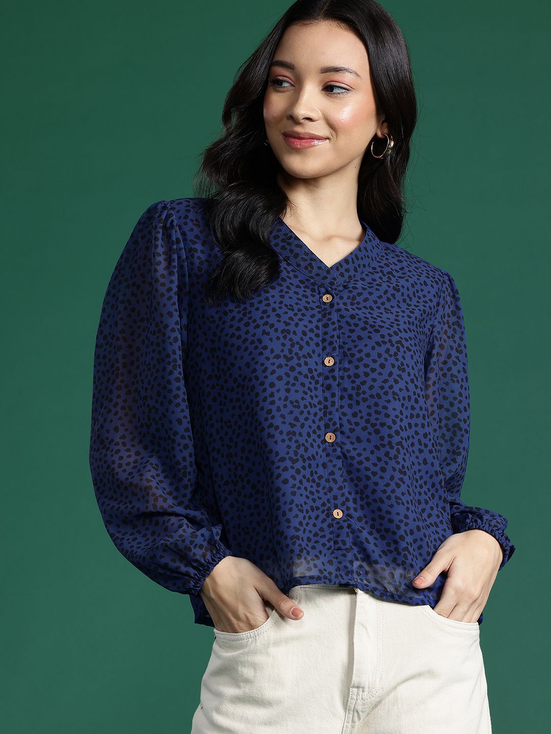 Navy blue animal printed opaque Casual shirt ,has a mandarin collar, button placket, long regular sleeves, straight hem, has an attached lining