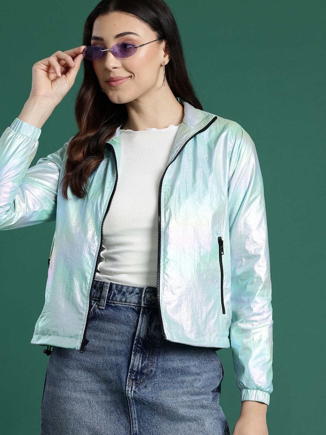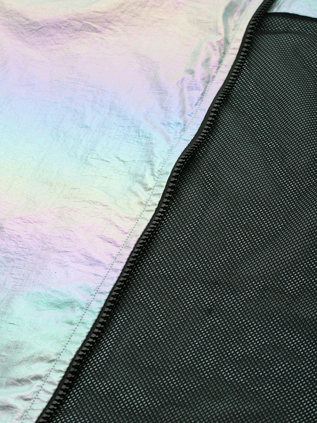 Dual-toned solid tailored jacket, has a mock collar, 2 pockets ,has a zip closure, long sleeves, straight hemline, polyester lining