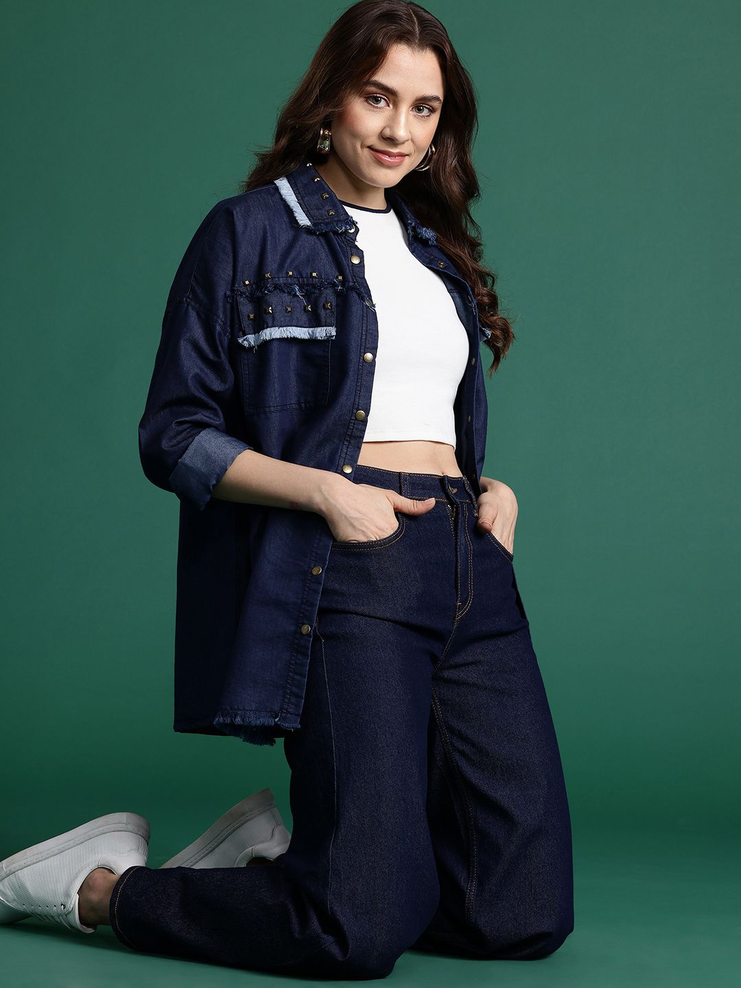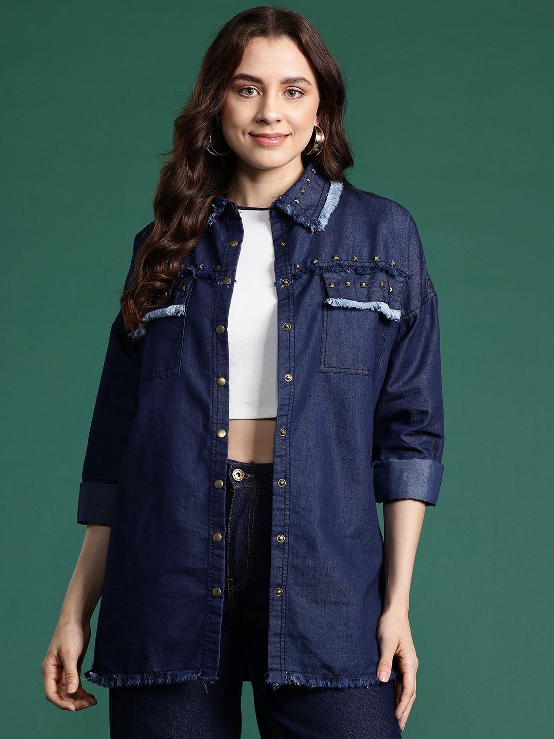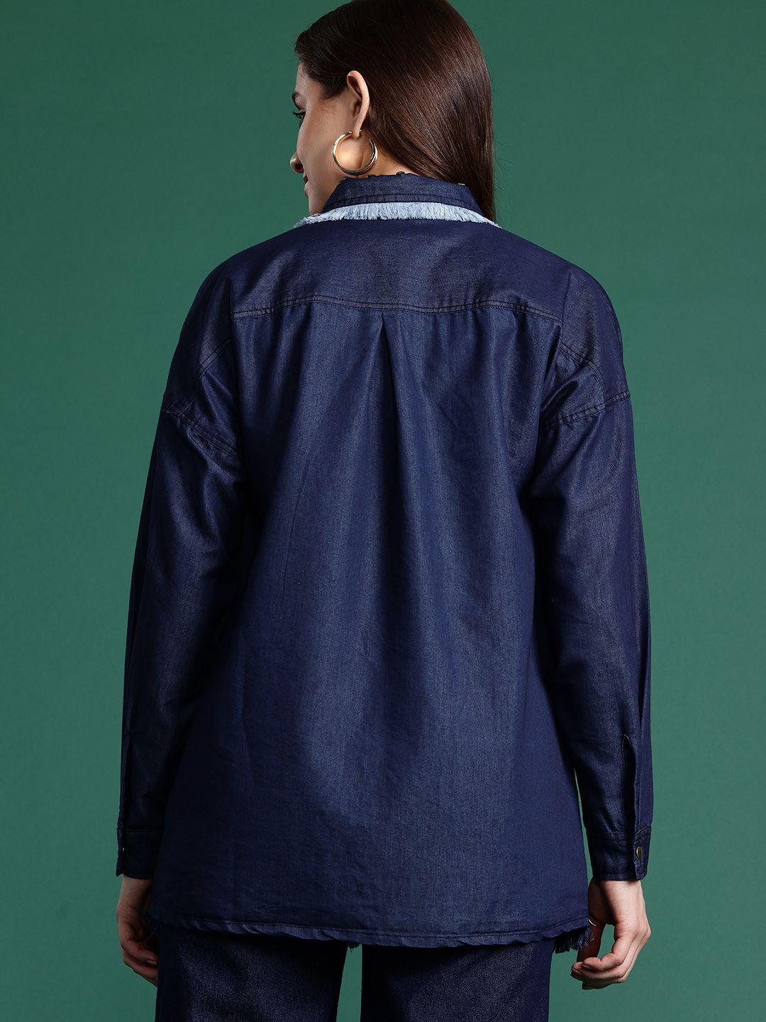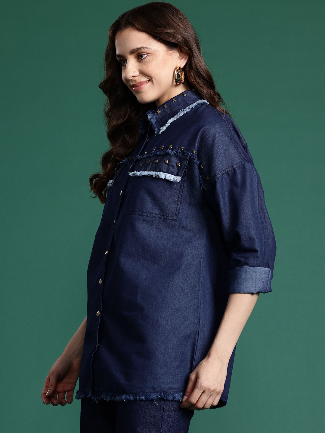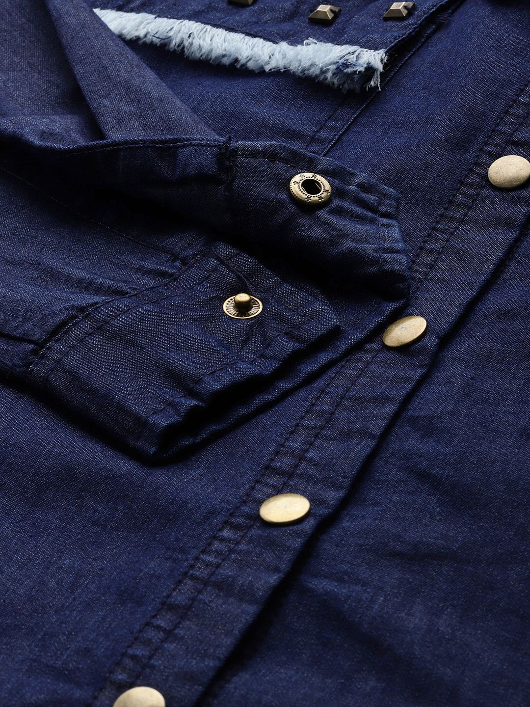 Blue solid opaque Casual shirt ,has a spread collar, snap button placket, 2 patch pocket, long regular sleeves, curved hem, fringed, embellished.