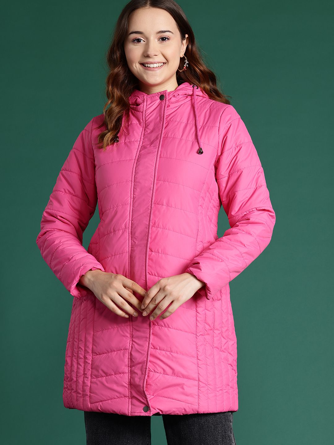 Pink solid padded jacket, has a hood, 2 pockets, a zip closure, long sleeves, straight hemline, and polyester lining