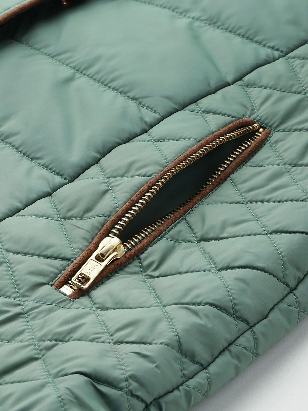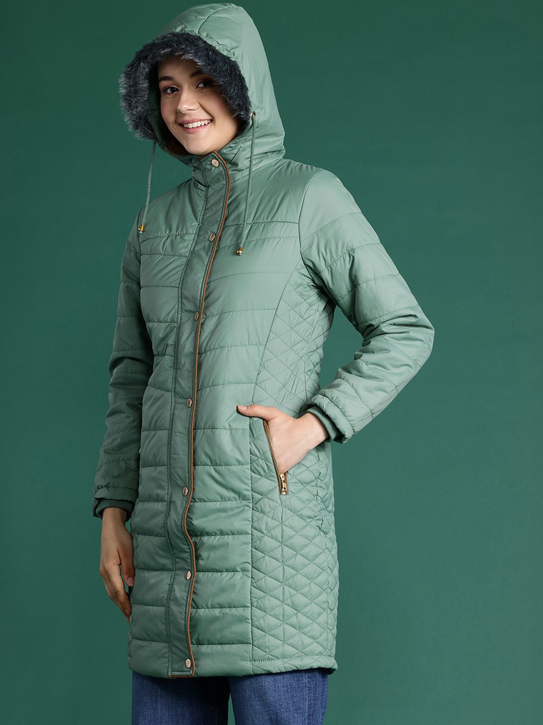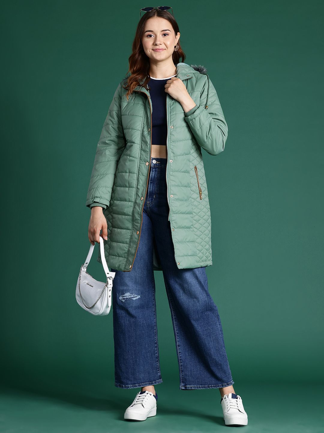 Green solid quilted parka jacket, has a hood, 2 pockets, snap button and a zip closure, long sleeves, straight hemline, polyester lining with inner pocket