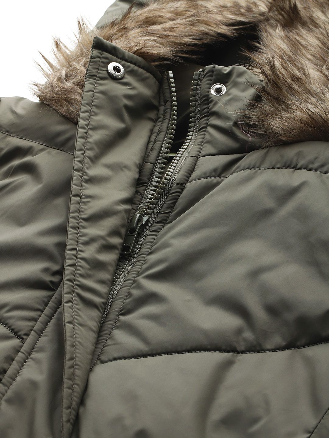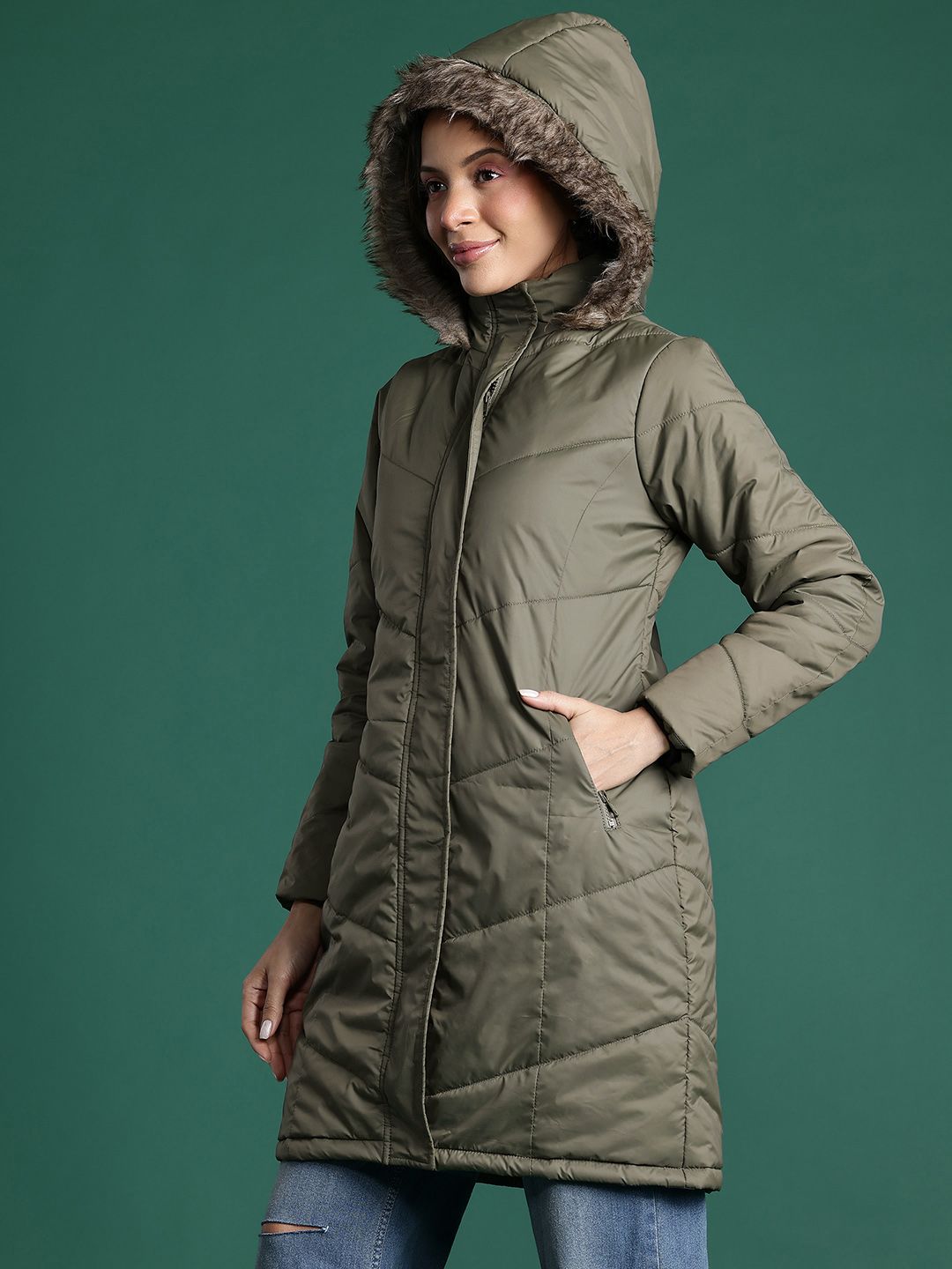 Olive green solid padded jacket, has a hooded, 2 pockets ,has a zip closure, long sleeves, straight hemline, polyester lining engineered with no