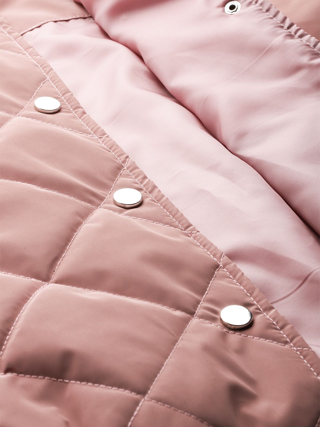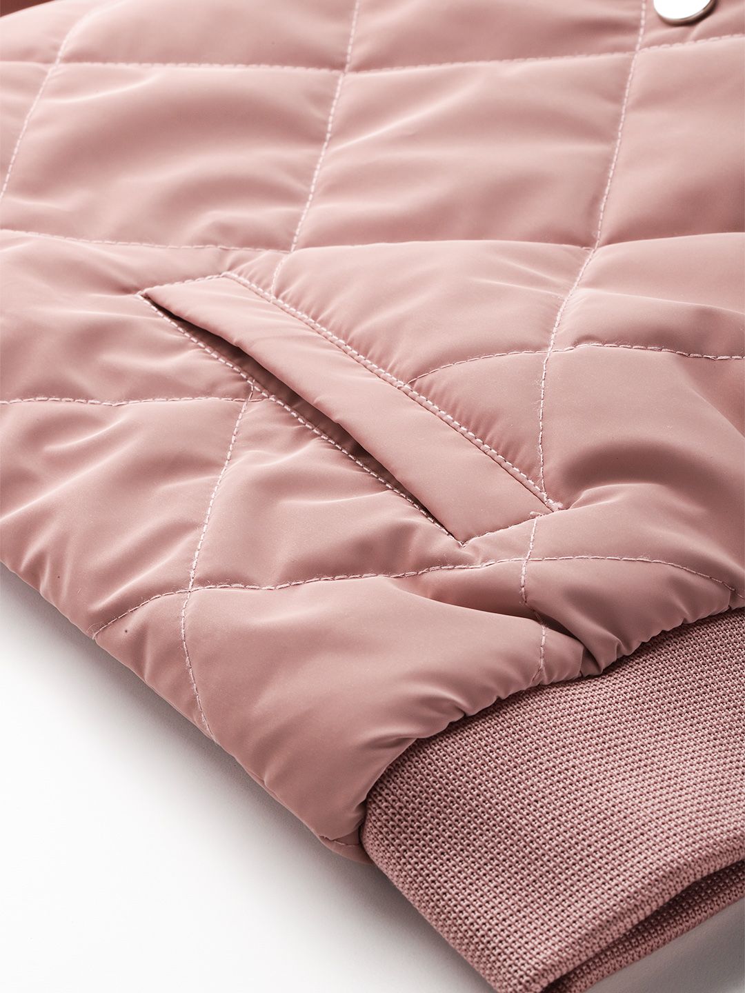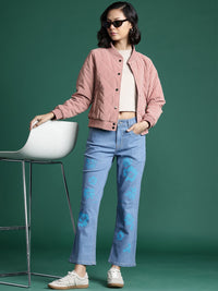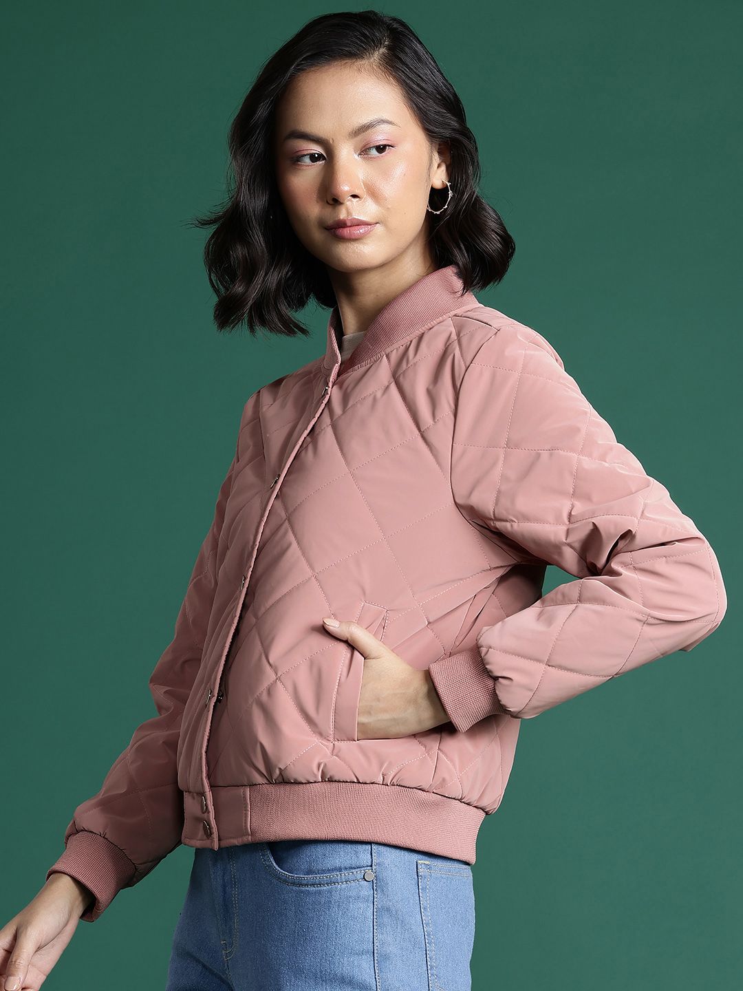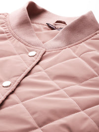 Dusty pink solid bomber jacket, has a stand collar, 2 pockets ,has a zip closure, long sleeves, straight hemline, polyester lining engineered with no