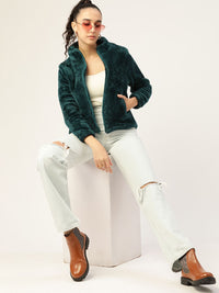 Green solid tailored jacket, has a mock collar, 2 pockets ,has a zip closure, long sleeves, straight hemline, without lining