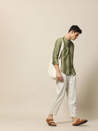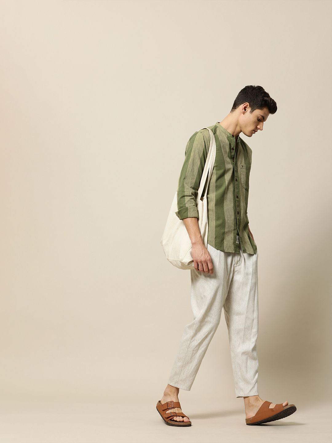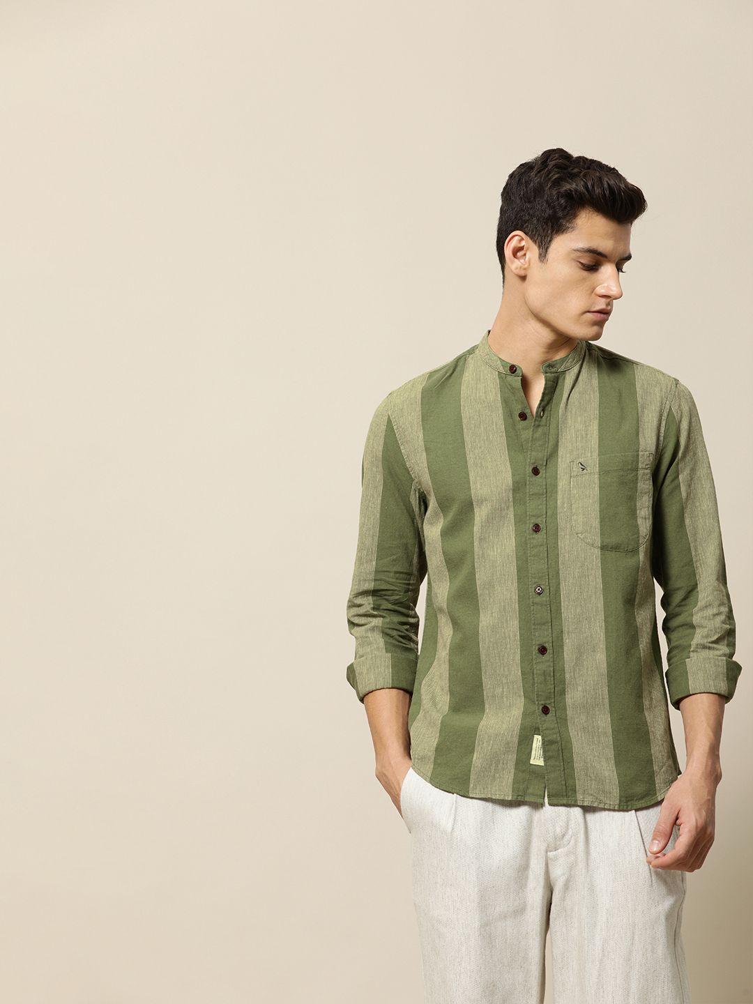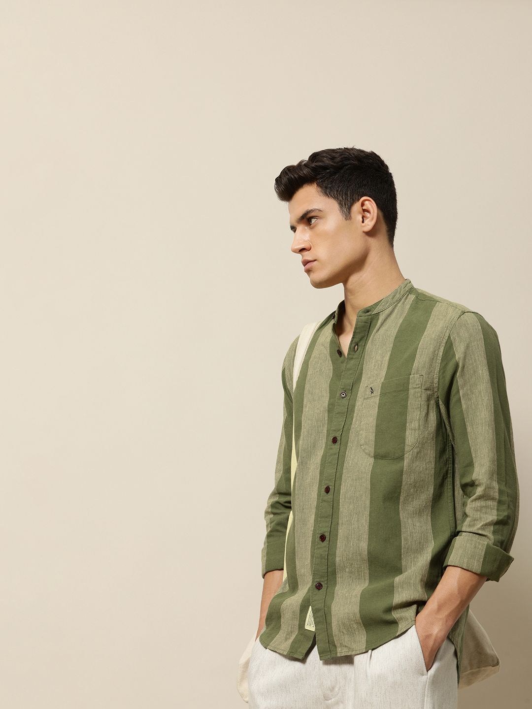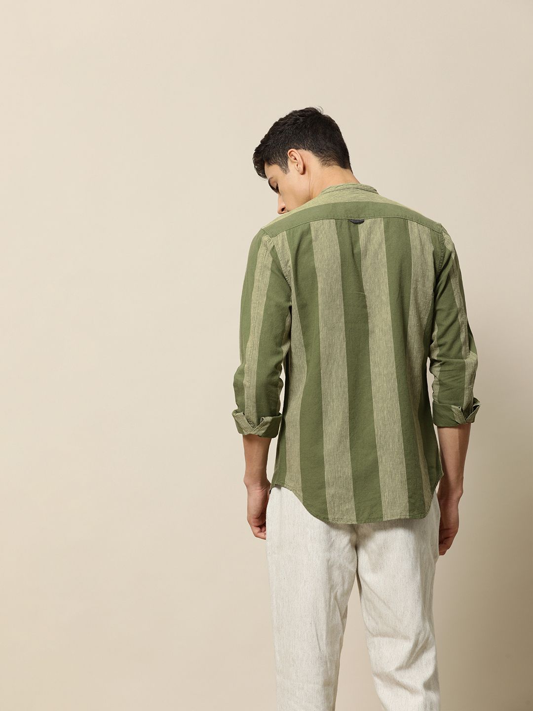 Mr Bowerbird Men Olive Green & Beige Tailored Fit Striped Cotton Linen Casual Shirt