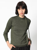 Green solid pullover ,has a turtle neck, long sleeves, straight hem