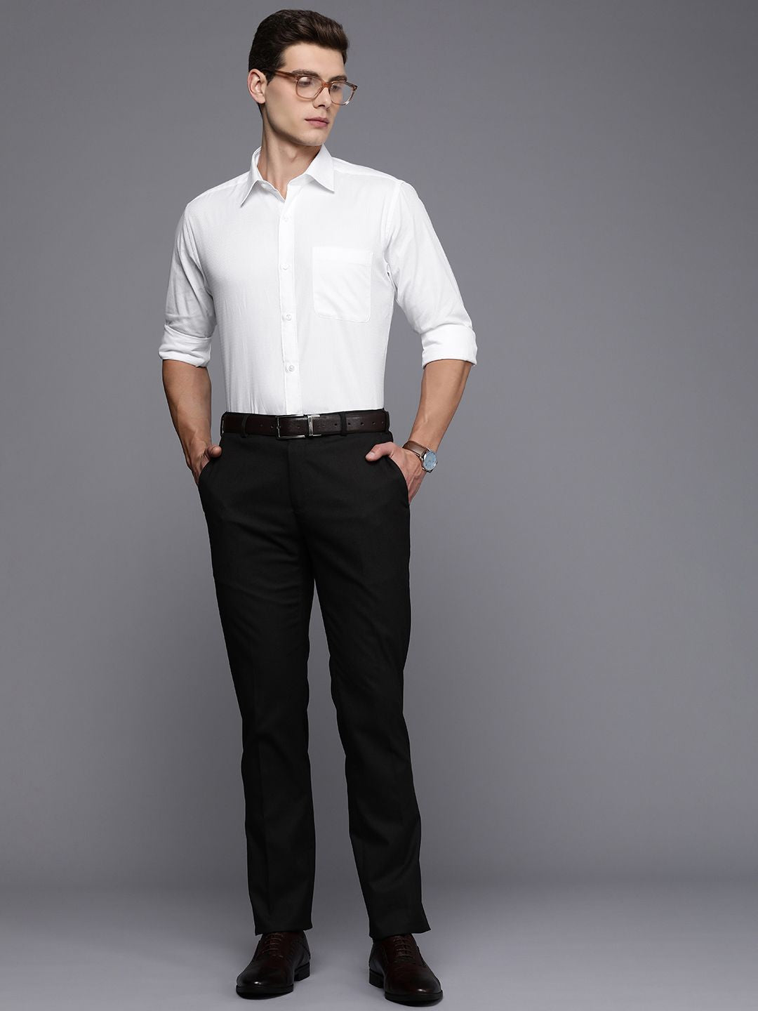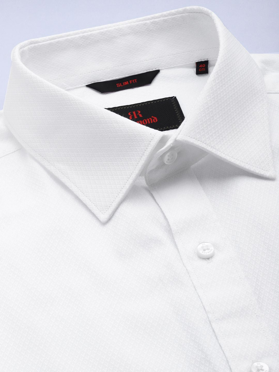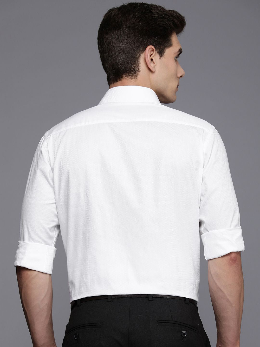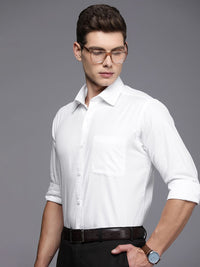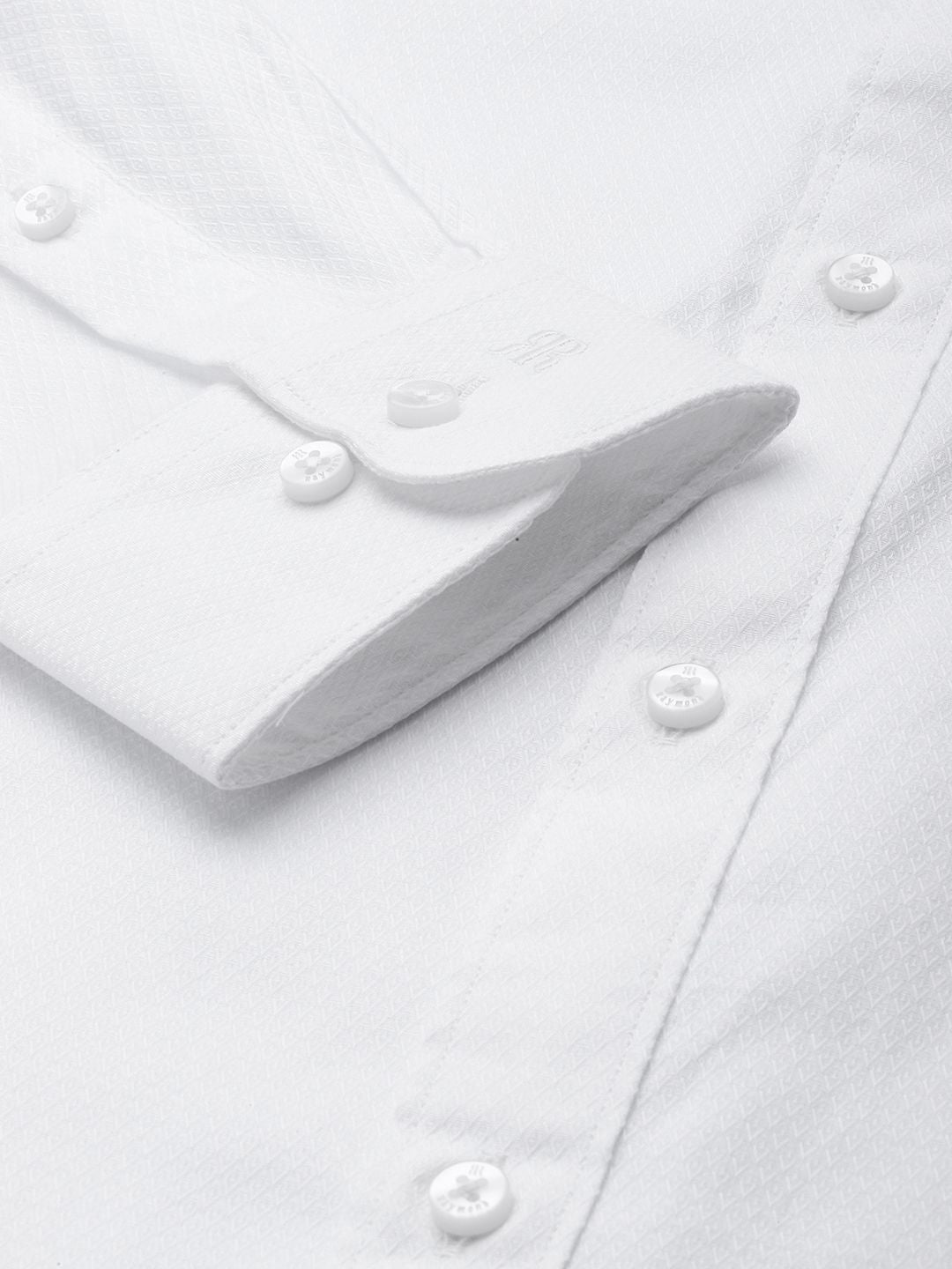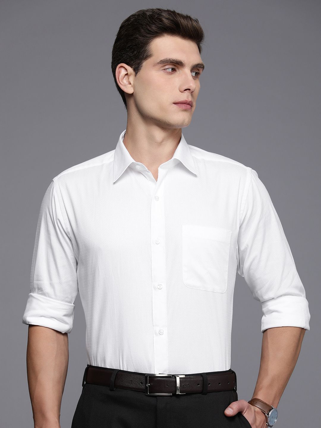 White solid self design opaque Formal shirt ,has a spread collar, button placket, 1 patch pocket, long regular sleeves, curved hem