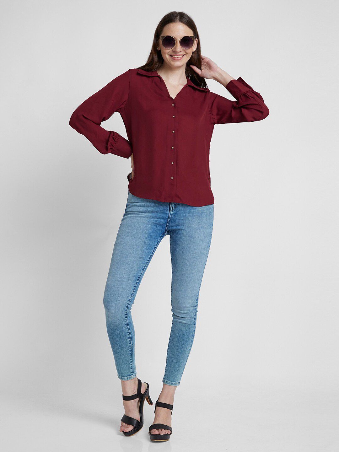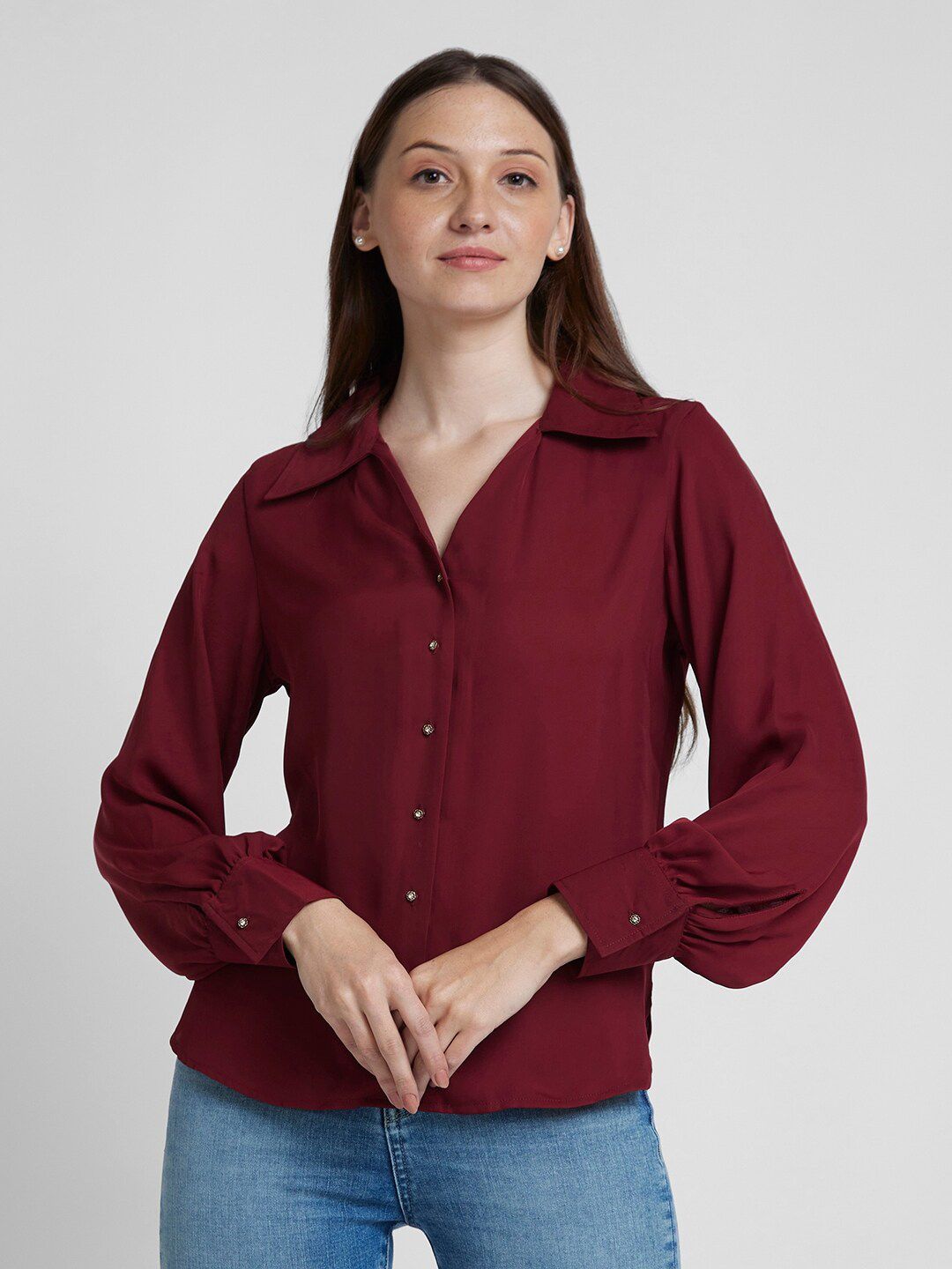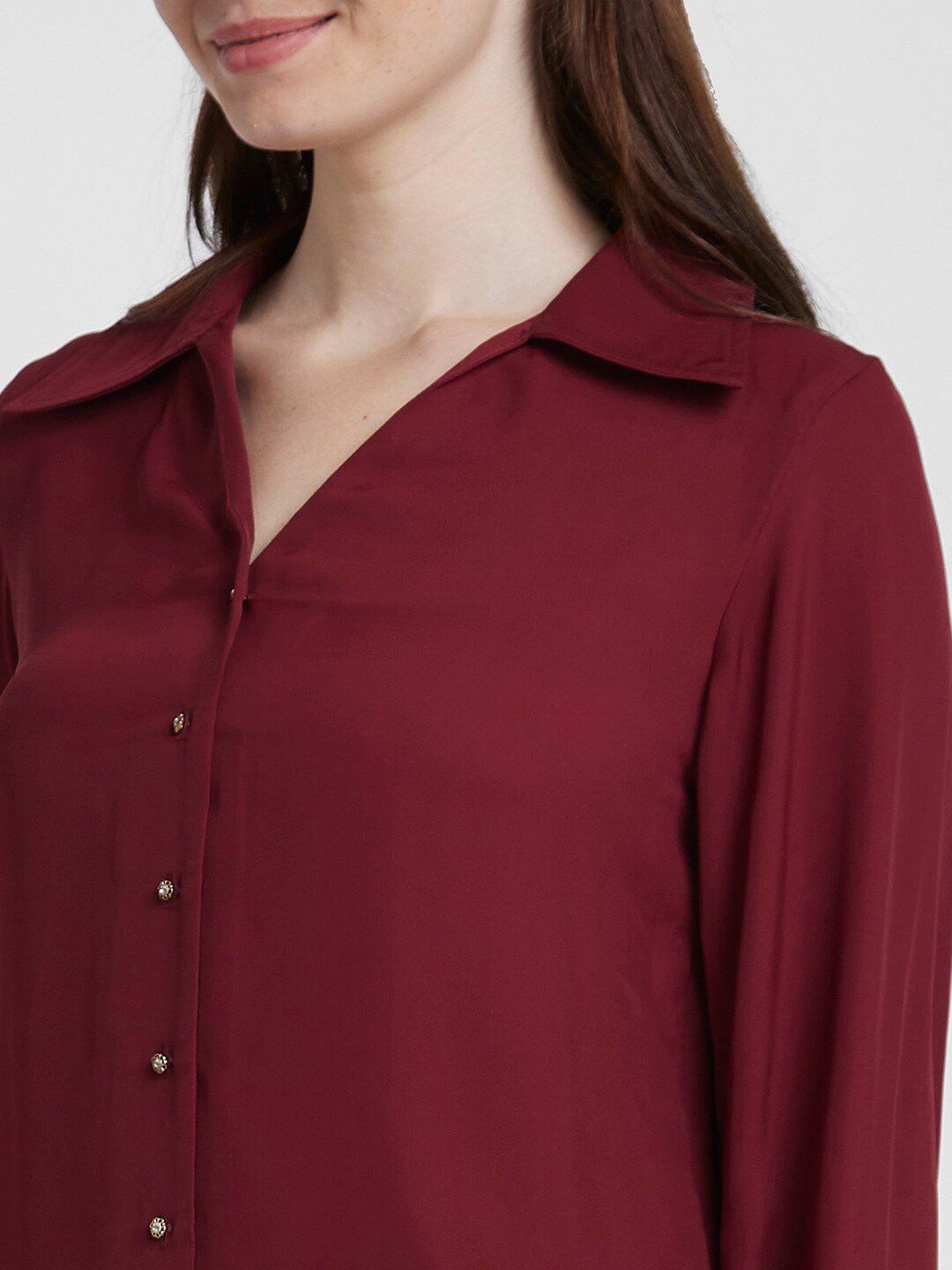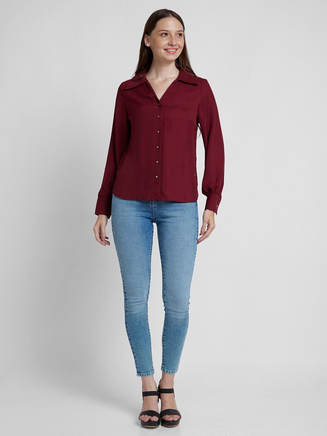 Red solid opaque Casual shirt ,has a spread collar, button placket, long regular sleeves, curved hem
