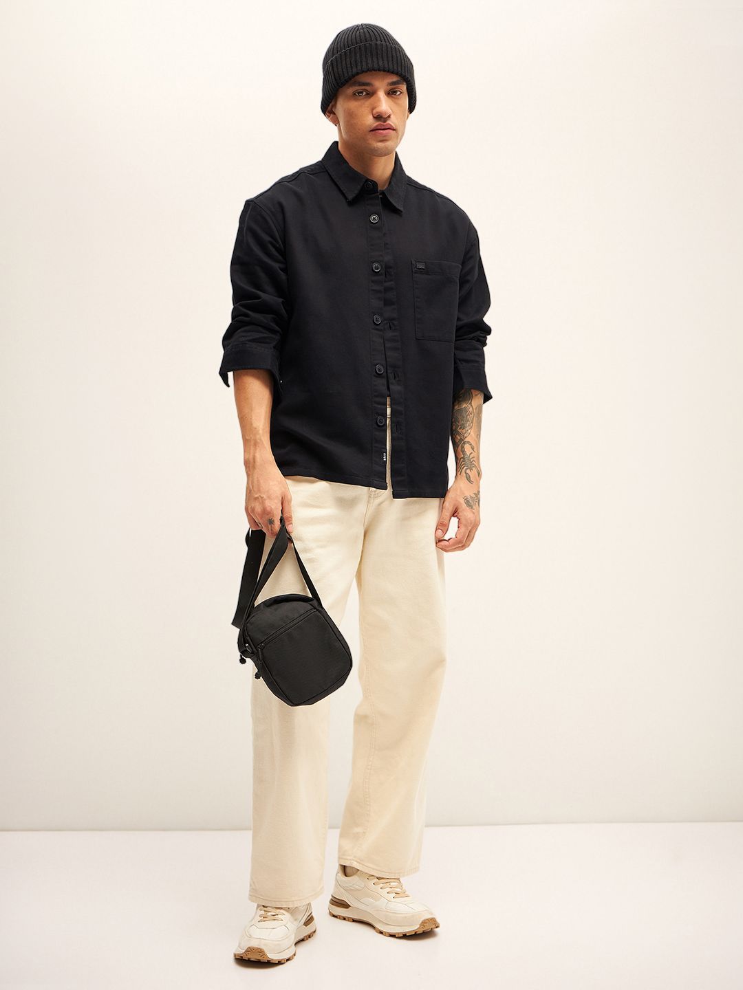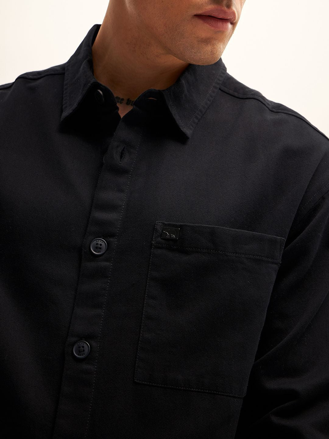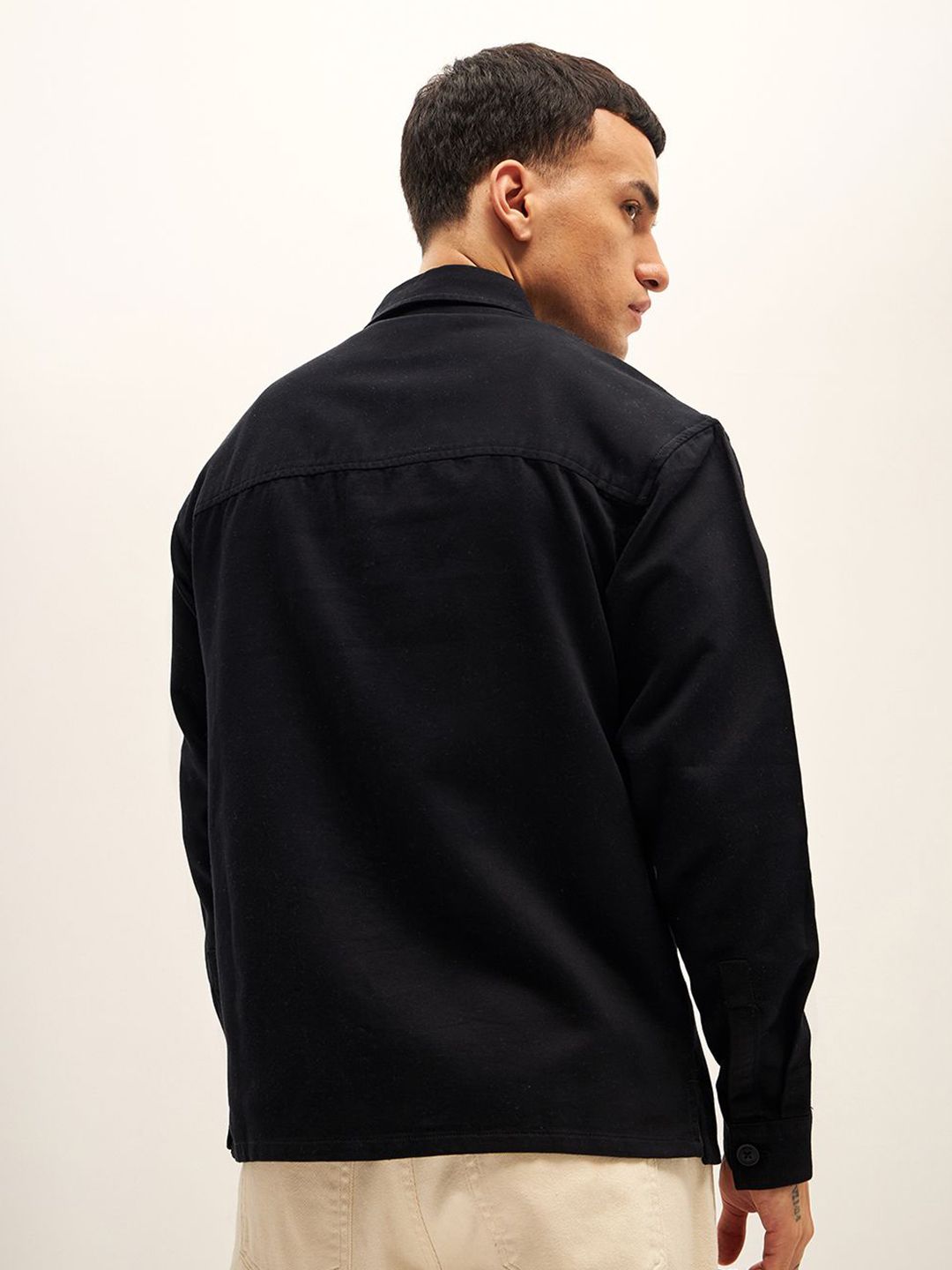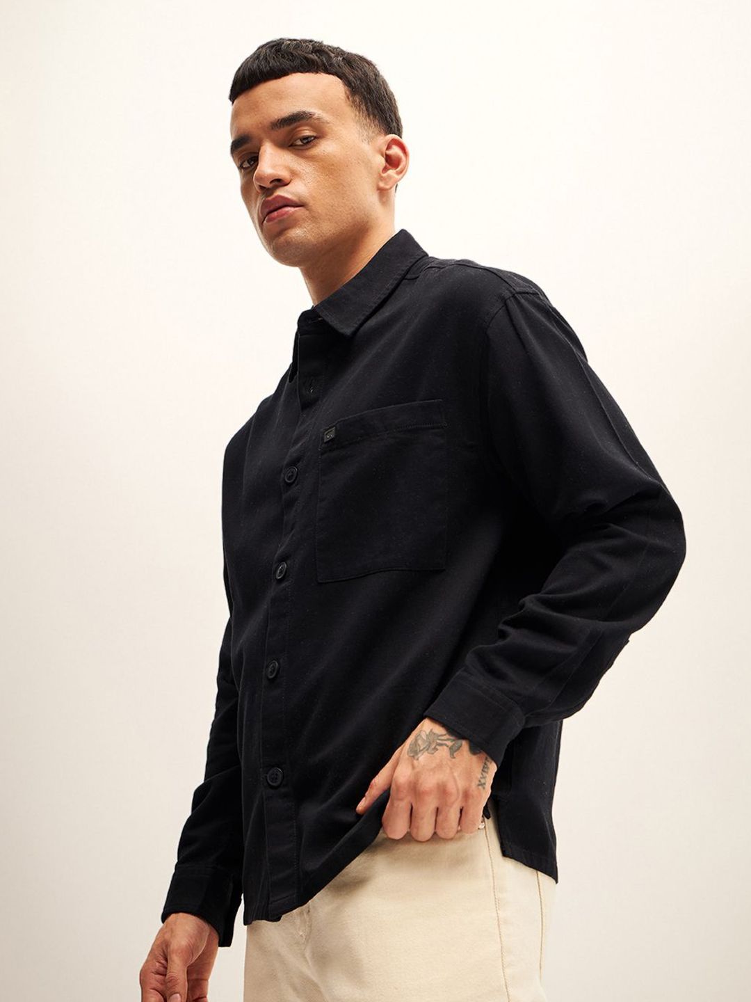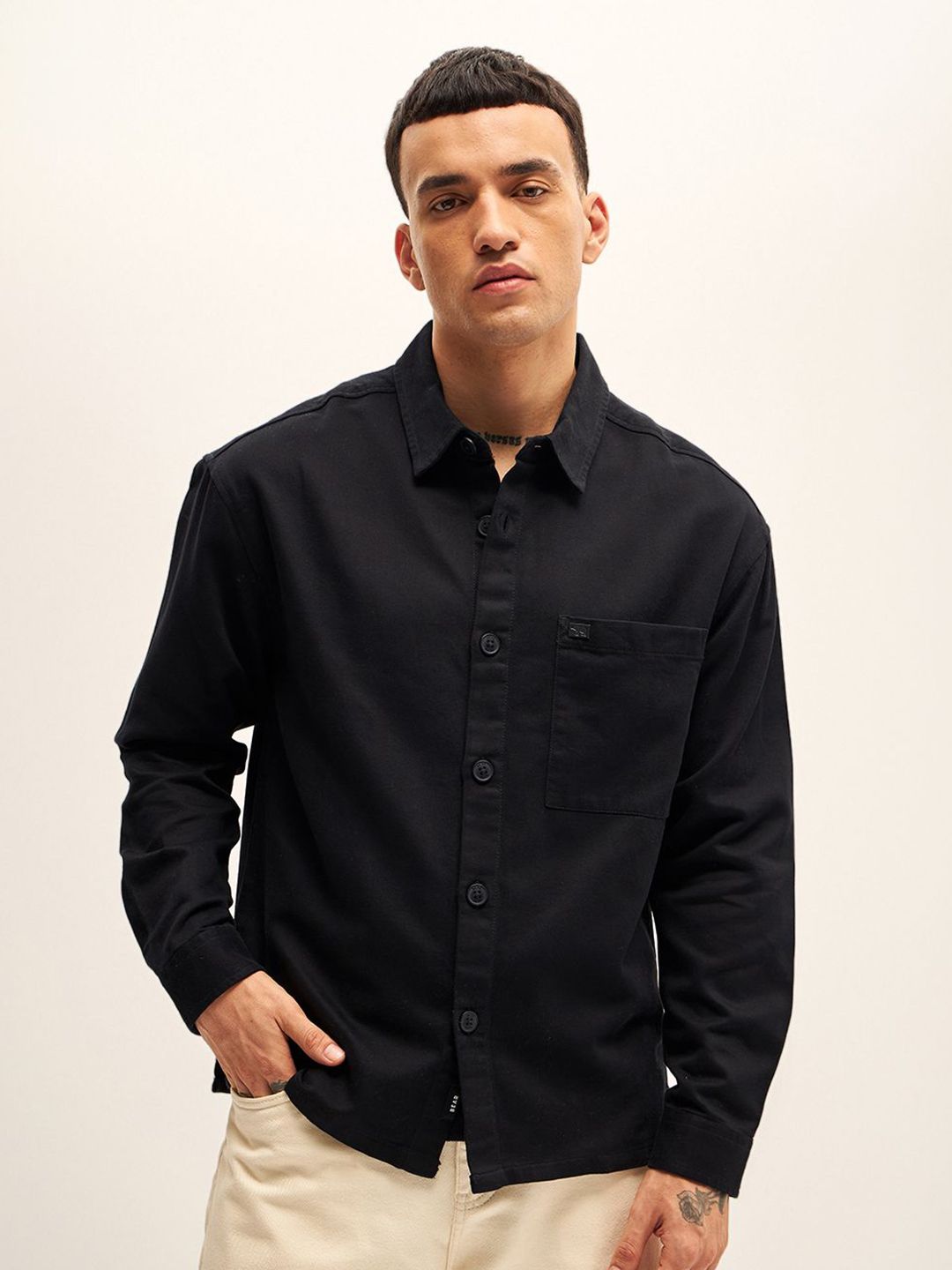 Black solid opaque casual shirt ,has a spread collar, button placket, 1 patch pocket, long regular sleeves, curved hem