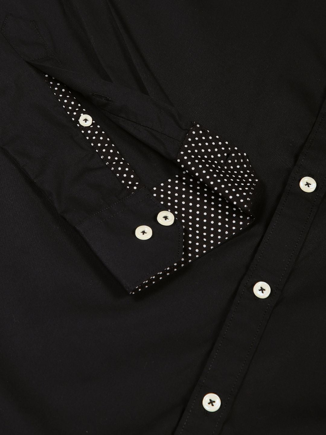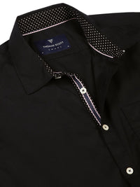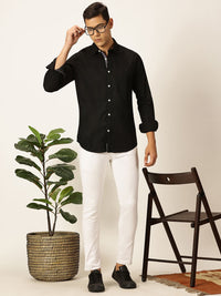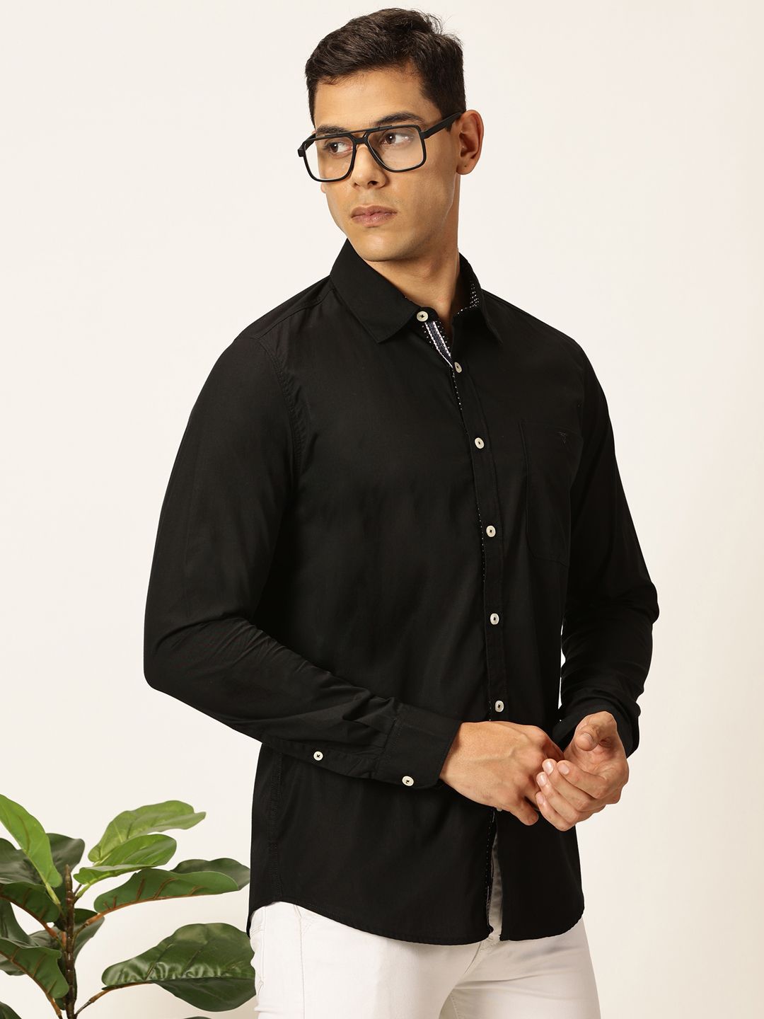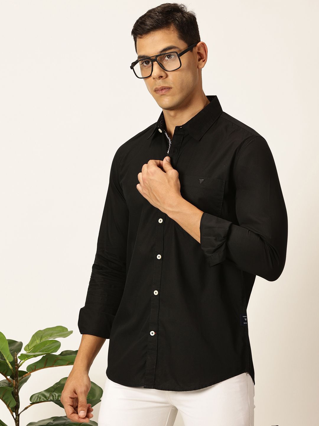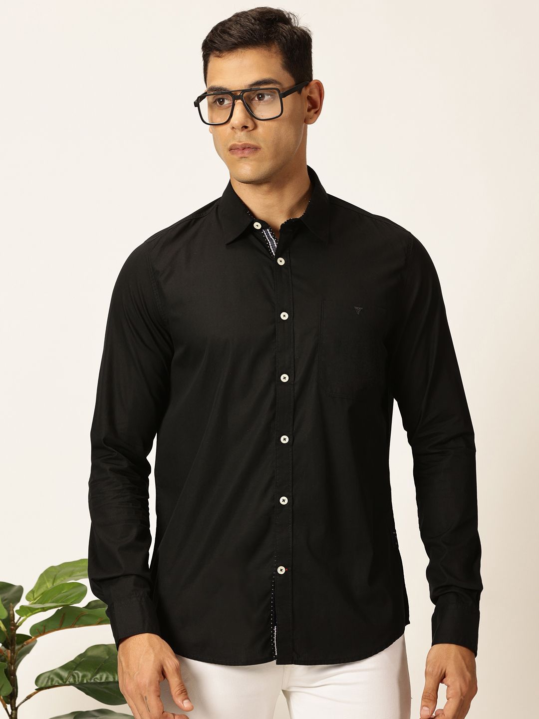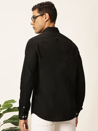 Black solid opaque casual shirt, has a spread collar, button placket, 1 patch pocket, long regular sleeves, curved hemline