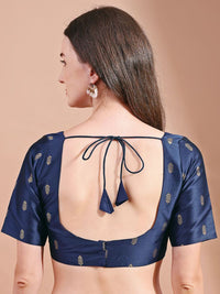 Navy blue woven design blouse has a v neck, short sleeves, and hook and eye closure with tie-up detail
